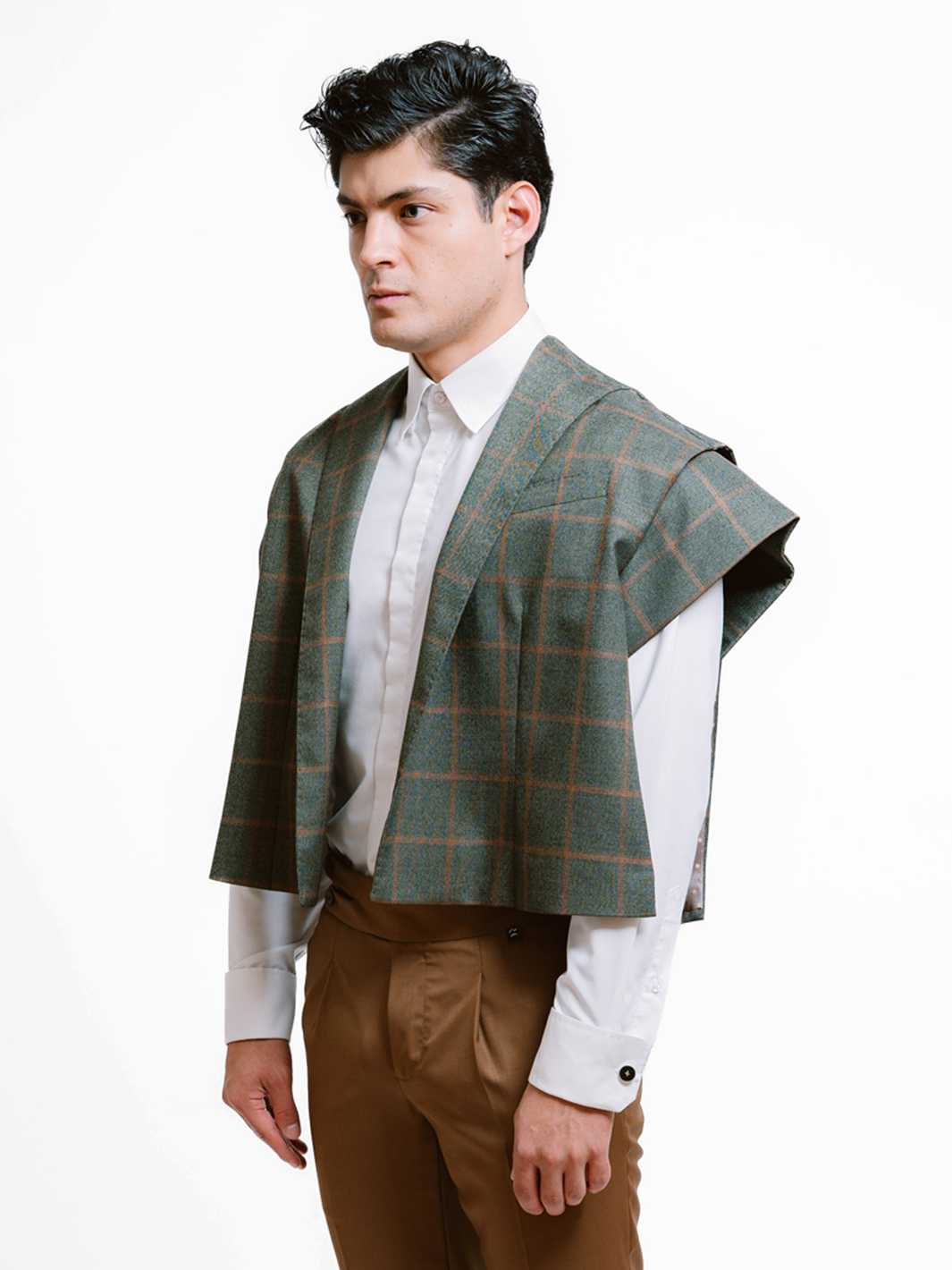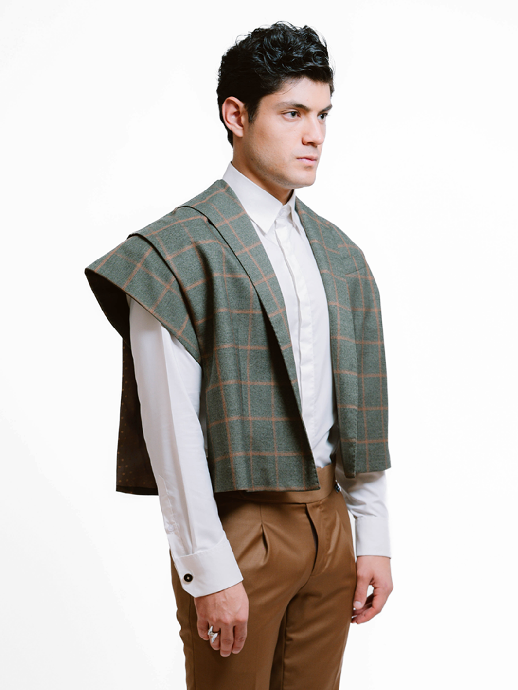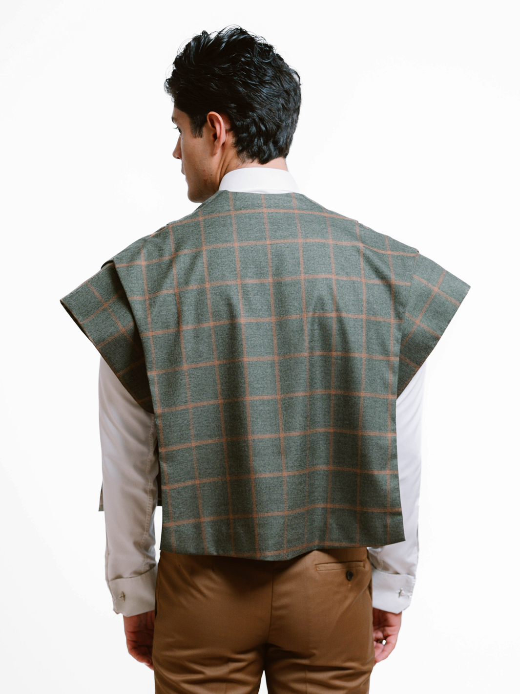 A modern statement layer, this cropped cape is tailored from a windowpane wool fabric and features pronounced shoulder pads that give a structured shape, creating a striking silhouette that elevates any look.