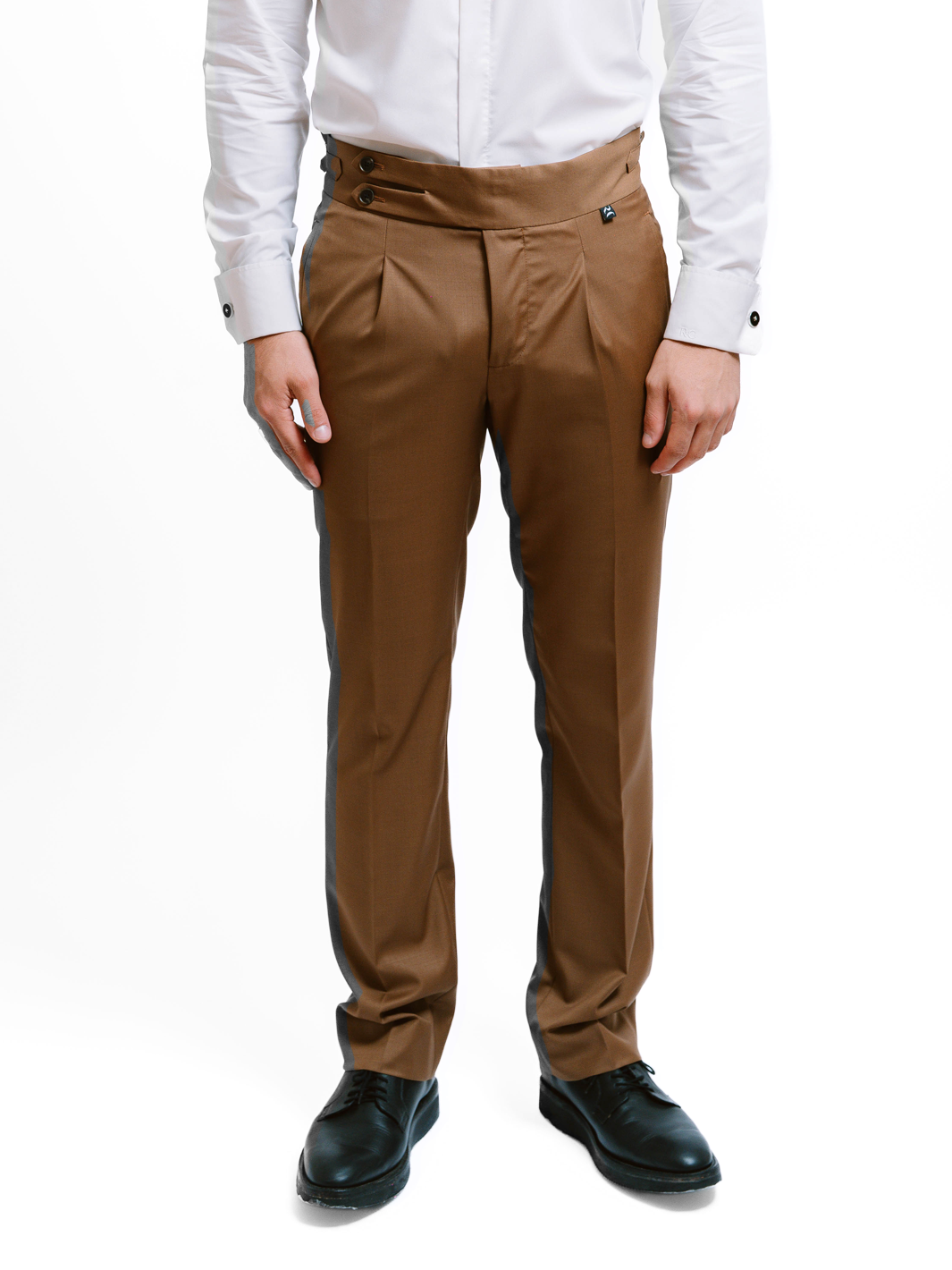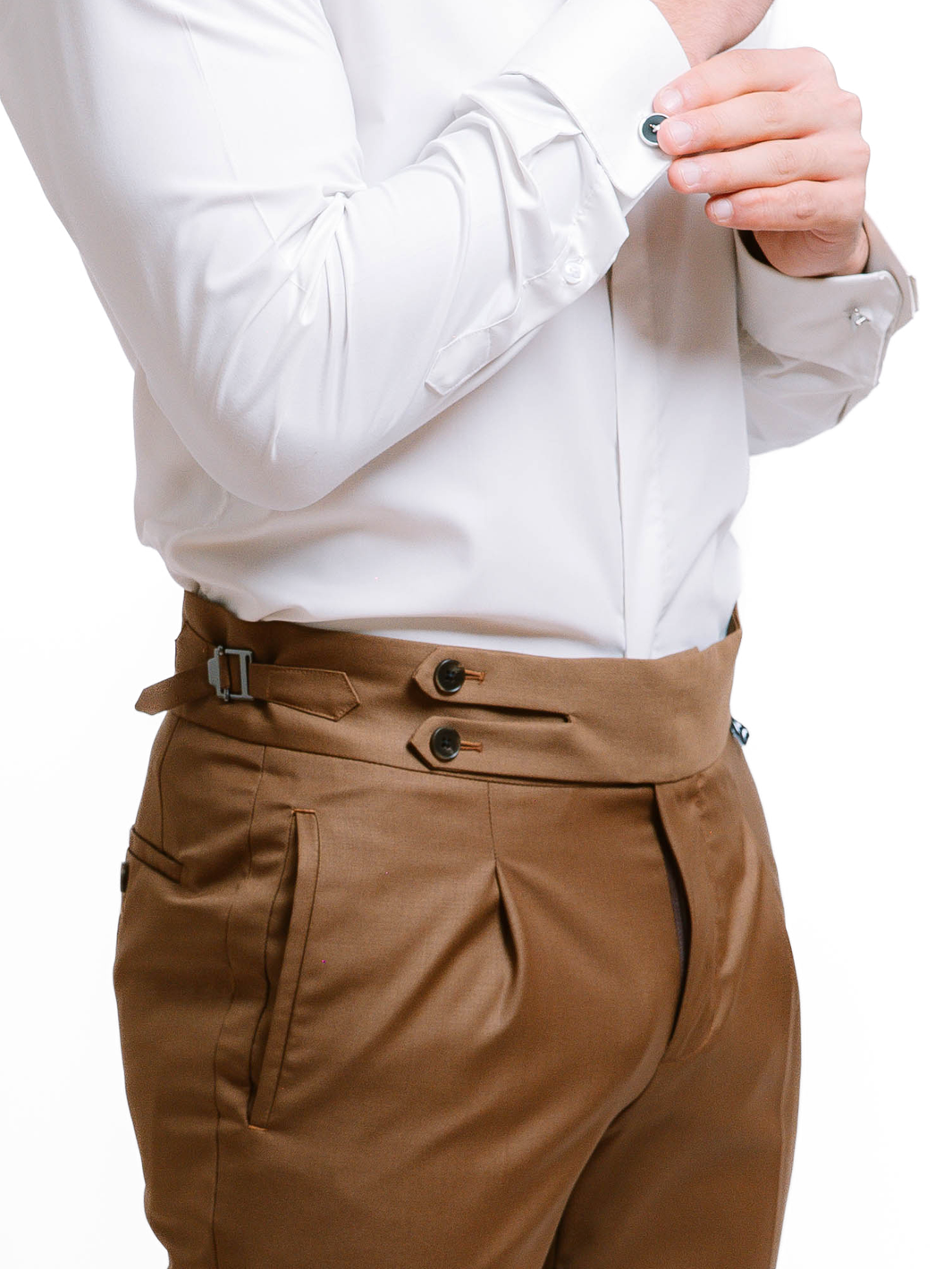• Wide Italian-style waistband on trousers