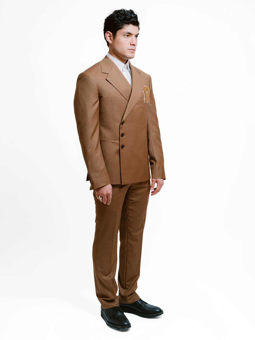 A contemporary twist on classic preppy style. Tailored in a double-breasted silhouette with wide, sharp notch lapels, the design features an R-patch on the chest and asymmetric pocket detailing—one side finished with a straight pocket, the other with a patch pocket—adding a modern edge. The look is completed with matching trousers, detailed with a distinctive wide waistband shape and adjustable waist tabs for a refined, customized fit.
